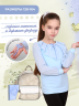 Блузка для девочек младшего школьного возраста, из однотонного трикотажного полотна - однотонная кулирка с лайкрой и шифона. Блузка полуприлегающего силуэта, с рукавом из шифона, без застежки. Спереди жабо со складками из шифона с декоративным элементом по центру. На спинке отсутствуют линии членения. Рукав длинный одношовный, присборенный по окату и низу, на манжете. Низ изделия подогнут. Срез горловины окантован.