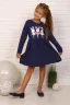 Платье для девочек дошкольного и младшего школьного возраста, из трикотажного полотна кулирка с лайкрой с рисунком. Платье прилегающего силуэта, отрезное и расклешенное от линии талии, с втачным длинным одношовным рукавом, с обтачкой в горловине. Низа рукавов и нижней части платья подогнуты. По шву втачивания обтачки в горловину проложена отделочная строчка. Спереди на верхней части платья нанесен печатный рисунок.