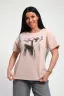 Футболка женская из гладкокрашенного трикотажа, хлопок 100%. Прямого силуэта, свободного облегания. горловина круглой формы. Рукав короткий. Низ изделия прямой. На полочке объемный принт, шелкография.