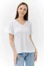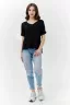 Футболка прямого силуэта, с V-образной горловиной, с разрезами в нижней части боковых швов. Спинка с кокеткой, удлиненная. Горловина обработана бейкой из основного полотна.