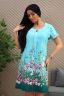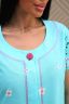 Халат женский из трикотажа. Хлопок 100%. Силуэт полуприлегающий, чуть расклешённый к низу. Горловина круглой формы. Рукав короткий. Низ изделия прямой. В боковых швах карманы. Застежка потайная, на тесьму молнию. Отделкой служит строчка контрастного цвета, в цвет обтяжной пуговицы.