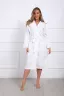 Модель халата: кимоно с воротником типа планка, длинными рукавами, накладными карманами, поясом. Фасон кимоно имеет свободный крой, отсутствуют какие-либо застежки, широкие рукава. Халат идеально сядет на любую женскую фигуру. Предназначение халата: для дома, бани, сауны, бассейна, spa-процедур.