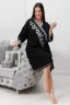 Халат-кимоно полуприлегающего силуэта, с боковыми карманами, длиной ниже колена, с рукавом длиной 3/4 на манжете. В нижней части боковых швов обработаны разрезы. Обтачка горловины халата и манжеты рукава выполнены из отделочного полотна.