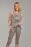 Стильный вискозный комплект с оригинальным печатным рисунком на майке трапециевидного силуэта, низ обработан контрастной полосой. Бриджи на притачном поясе с регулировкой на кулисе, низ на манжете.