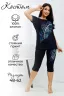 Костюм женский из кулирного полотна состоит из футболки и бриджей. Футболка прямой силуэт, горловина круглая, рукав короткий втачной, низ изделия обработан на плоскошовной машине, на полочке принт. Бриджи - прямые, верх на резинке, низ обработан на плоскошовной машине.