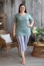 Костюм женский: туника и бриджи. Туника полуприлегающего силуэта с фигурным Y-образным вырезом. Рукав короткий цельнокроенный со швом. На полочке нагрудный карман с пуговицей, из отделочной ткани в полоску. В боковых швах туники и бриджей небольшие разрезы. Бриджи из ткани в полоску, длина ниже колена, на передних частях внутренние карманы, пояс обработан на многоигольной машине. На модели 52 размер