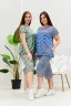 Костюм женский, туника и бриджи. Туника расширенная к низу с боковыми разрезами, низ фиксируется завязками. Горловина Y-образная, рукав короткий цельнокроенный, около плечевого шва небольшая сборка. Кокетка полочки и спинки из двух частей в полоску, соединяющихся под наклоном. На полочке накладной фигурный карман. Бриджи прямого силуэта, внизу брюк разрезы и утяжки. На передних частях внутренние карманы и боковые с бантовой складкой. Пояс выполнен на многоигольной машине.