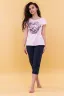 Костюм универсален: его можно носить дома, на любимой даче и как на дневной променад. Бриджи-капри заужены к низу, на поясе с широкой простроченной резинкой 3см. Свободный крой на уровне бёдер и живота, благодаря кокетке на поясе и складкам. Длина до середины икры. Благодаря хорошему составу 50% х\б и 50% п\э бриджи не растянутся на коленях. Футболка оформлена полноцветной печатью, поэтому ягоды кажутся натуральными. Горловина-лодочка. Очень удобный крой. Оттенок ткани бриджей может отличаться от представленного на фото