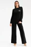 Костюм женский из футера 2 нитки, состоит из туники и брюк. Туника полуприлегающего силуэта, длиной до бедер, рукав втачной, длинный, с манжетой по низу. Горловина округлой формы с обтачкой. По переду нанесен дизайнерский принт. Брюки прямые, свободные, длинные. Притачной пояс на резинке, внутренние боковые карманы с наклонным входом.