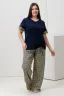 Костюм состоит из туники и брюк. Туника прямого силуэта, с V-образной горловиной. Рукав втачной, короткий, с разрезами и манжетом из отделочного полотна. В нижней части полочки обработана кулиса со шнуром. Горловина обработана бейкой из основного полотна. Брюки прямые, свободные, на поясе, с боковыми карманами.