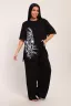 Трикотажный комплект из вискозы с удлиненной футболкой и боковыми разрезами по бокам и широкими брюками.