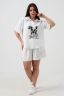 Представляем вам новинку - женский костюм-двойка, состоящий из футболки и шорт. Наряд состоит из свободной футболки-рубашки с однотонным принтом и шорт свободного кроя на резинке. Для удобства шорты имеют 2 кармана.