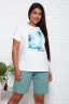 Костюм женский: шорты с боковыми карманами, на поясе и футболка классическая с короткими рукавами и стильным принтом на груди. Трикотаж отличного качества подарит комфорт и презентабельный вид.
