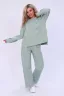 Модный женский костюмчик из плотной ткани. Брюки свободные с карманом, широкие внизу. Кофта свободная по боковым швам разрез. Спинка длиннее, что делает модель модной и стильной. Рукав длинный со складочками на манжете. На груди принт не броский, но придающий вид.