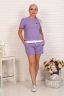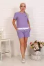 Костюм женский трикотажный - футболка и шорты. Футболка укороченная с отделкой по низу контрастного цвета. Шорты короткие с завязками и втачными боковыми карманами. На футболке и шортах небольшие отделочные печати.