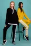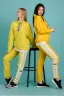 Костюм состоит из толстовки и брюк. Толстовка прямая, свободная, с капюшоном, с длинным рукавом на манжете. Низ полочки и спинки завершен поясом. Брюки с карманами, на поясе. Вдоль боковых швов расположены лампасы из отделочного полотна.