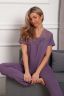Пижама женская из вискозы. Состоит из туники и брюк. Верх прямого силуэта, чуть расклешённый к низу, ниже середины бедра. Рукав короткий. Горловина V-образной формы, отделана кружевом. Низ прямой. Брюки прямые, зауженные к низу. Пояс цельнокроеный, на естественном месте.
