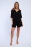 Пижама состоит из кофты и шорт. Кофта кроя оверсайз с застежкой на пуговицы и короткими рукавами на спущенном плече. Шорты с карманами, свободного кроя и удобной длинны.
