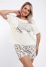 Женская пижама представляет собой комплект из 100% хлопковой футболки с принтом надписей и стрекоз, а также хлопковых шорт с набивным рисунком в виде стрекоз.