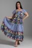 Платье женское расширенное к низу. На полочке планка до линии талии , застежка на четыре петли-пуговицы. Нижняя часть платья состоит из трех ярусов , верхняя часть которых присборена. Бретели расширены, имитируя короткий цельнокроенный рукав.В боковых швах внутренние карманы. Бретели, планка и средний ярус из отделочной ткани "в полоску".