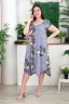 Платье женское, расширенное к низу. Полочка и спинка состоит из двух симметричных частей из тканей компаньонов: полоса и пальмы. На полочках накладные карманы. Рукав втачной, укороченный. На плече рюши, имитирующие бретель. Низ платья с углами, длина по спинке замерена от плечевой точки до верхнего угла низа.