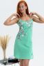 Сорочка на бретелях полуприлегающего силуэта, с фигурной линией низа, длиной выше колена. На полочке внизу обработан декоративный разрез. Проймы, бретели и разрез на полочке обработаны бейкой из основного полотна.