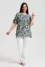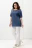 Туника прямая, свободная, с округлой горловиной, с удлиненной спинкой. Рукав короткий, с манжетом и хлястом с пуговицей. В верхней части полочки обработаны декоративные защипы. Спинка с кокеткой. В нижней части боковых швов расположены разрезы. Горловина обработана бейкой из основного полотна.