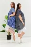 Туника женская, к низу расширенная. Рукав короткий цельнокроенный с манжетой. Горловина Y-образная. Полочка состоит из четырех асимметричных частей, две части по диагонали из ткани в горошек, две другие - из мелкой полоски. Низ фигурный, фиксируется утяжками. По боковым швам разрезы. На полочках два накладных кармана, форма карманов квадраты, расположенные по диагонали, верхние уголки карманов зафиксированы декоративными пуговицами "кокос". Также пуговицы пришиты на отогнутых уголках манжет. Сочетание тканей "горошка" и мелкой полосы придают изделию своеобразную особенность.