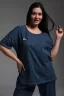 Туника прямого силуэта, с округлой горловиной, с удлиненной спинкой, длиной до середины бедра. На полочке расположены фигурные накладные карманы. Полочка и спинка с кокетками. Рукав короткий. В нижней части боковых швов обработаны разрезы. Горловина обработана бейкой из основного полотна.