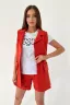 Жилет полуприлегающего силуэта, длиной до середины бедра, с английским воротником. В нижней части полочки расположены накладные карманы с клапаном.